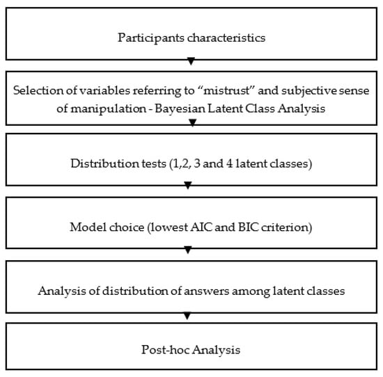 To achieve the research objective, we decided to resort to latent class analysis. Figure 1 presents the particular phases of the analysis of the obtained data. The model was built on the basis of selected variables referring to “mistrust” and, therefore, a subjective sense of information asymmetry and manipulation using the BayesLCA package in the R environment (v.3.4) [93]. For this purpose, the obtained results were recoded into binary data—on the basis of responses on a Likert scale, the answer “0” indicates an answer below the median for a group, while the answer “1” indicates an answer above the median. In the course of the analysis, four dependent variables with the highest weighting were identified (Y61, Y62, Y63, Y64). Detailed results are shown in Table 2.