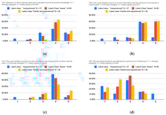Trust in social proof of rightness—answer differences among four latent classes: (a) Y22 “Opinions of other Internet users are a valuable source of product knowledge”; (b) Y28 “The most reliable source of on-line information are the opinions of my friends in social media” (c) Y32 “The most reliable source of on-line information are the opinions of other Internet users”; (d) Y53 “My purchase decisions are affected by opinions from influencers”.