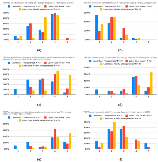 Attitudes towards online advertising—answer differences among six latent classes: (a) Y38 “Ads are often fun and interesting”, (b) Y40 “Ads improve the standard of living”, (c) Y43 “Ads pretend to be informative, while they are just meant to persuade one to make a purchase”, (d). Y44, “Ads create a society of materialists” (e) Y46 “Ads are playing on emotions to persuade one to make a purchase”, (f) Y86 “Ads are incomprehensible”.