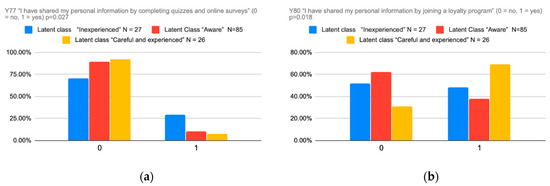 Willingness to share personal information online—answer differences among two latent classes: (a) Y77 “I have shared my personal information by completing quizzes and online surveys”; (b) Y80 “I have shared my personal information by joining a loyalty program”.