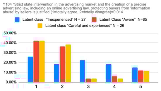 By analyzing the response schedules, a qualitative characterization of the representatives of the various hidden classes can be provided. In the case of the latent class tentatively determined as “inexperienced”, we deal with people who actively use the Internet, but use it for professional purposes to a lesser extent (Y18, compared to representatives of other groups). They are also persons that have a relatively lower confidence in online reviews (Y22, Y28); however, they are more aware of the impact of influencers (Y53). The “inexperienced” are less aware of the manipulative nature of advertising (Y43) and its impact on society’s materialism (Y44). Their attitude toward personalizing online advertising content, particularly with respect to search history in search engines, was rather positive (Y59). These are often people who share their personal information by filling out quizzes and questionnaires online (Y77). Interestingly, compared to representatives of other groups, the “inexperienced” were the least enthusiastic about the issue of strict state intervention in the market for online advertising (Y104).
