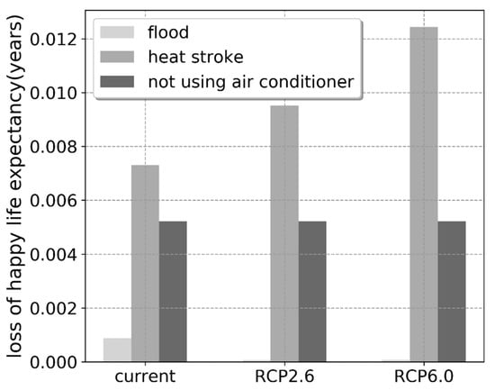 In the future, the contribution of both flood and heatstroke risk to LHpLE will change. But the contribution of not being able to use an air conditioner could not easily be estimated because customs and technology related to air conditioner use are expected to change dramatically. Therefore, a situation in which the entire population could not use an air conditioner for a single day per year was considered. For this situation, the decline in well-being due to not using an air conditioner was estimated as follows:
