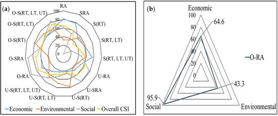 The first part of the results focused on the case where the weight was distributed equally among the three main dimensions (one third each) and furthermore equalized within the criteria of each dimension. The radar graph in Figure 3a shows the four indices for the fifteen design alternatives for the Case 2A (Asharej Roundabout—2008) scenario. Figure 3b shows the final ranking of each design alternative for this scenario in a line-graph, while Figure 3c shows the sustainability trade-offs for the most sustainable design alternative, which is O-RA. Figure 3b,c show that the best design alternative (O-RA) has a tendency towards the social dimension when compared to the other design alternatives. The previous analysis was repeated for the remaining spatial and temporal scenarios of the four roundabouts. Table 6 shows the results of the sustainability assessment with the corresponding CSI values and the dimensional tendency for equal weight scheme.