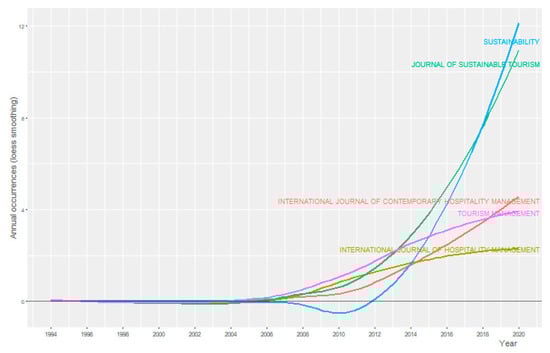 Figure 2 shows the evolution from 1994 to 2020 of the publications in the five leading journals: Journal of Sustainable Tourism, Sustainability, Tourism Management, International Journal of Contemporary Hospitality Management and International Journal of Hospitality Management. Looking at the graph, we can indicate that in the first years there were no publications in these journals. The first of them to publish a paper linking CSR and tourism was Tourist Management in 2007, so in the previous 13 years none of the top journals published on our subject. According to the graph, in 2010, four of the five journals had already published some work. The last source to publish was Sustainability, which began in 2013, and reached its highest number of papers in 2019, publishing a total of 23, making it the second journal to publish work in this field. 2019 was the year in which most articles relating to CSR were published in the tourism sector. However, it is also worth mentioning that in 2018 there was a significant peak in the number of papers published in these five journals.