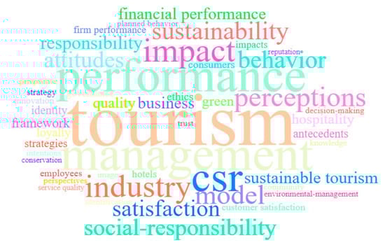 To understand the use of the keywords used with tourism and CSR, the keywords in the cloud allowed a mental imagery []. Figure 3, shows the word cloud generated by Biblioshiny of the Bibliometrix software. The word cloud highlights the aspects related to tourism and CSR. The author’s keywords are selected in the graphic parameters. The most significant advantage of being able to choose these keywords is to highlight the main topics and trends in research []. As the figure shows, tourism, management, performance, and CSR were the main keywords used in the documents produced.
