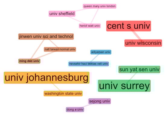 Bibliometric analysis, as we know, highlights the so-called co-authorship. This analysis helps to determine the structure of collaborative research networks in a specific field. This includes the self-organising behaviour of the research areas. The nodes reveal the most influential institutions, and the thickness and distance between nodes indicate the degree of collaboration []. Figure 5 shows the most influential institutions that have researched tourism and CSR with colleagues from other countries. Thus, it is possible to observe four significant clusters. The first, in green, groups the University of Surrey (England), as the strongest collaborating institution in this group, with Sun Yat-sen University (China). In orange, the second cluster highlights the University of Johannesburg, which collaborated with Washington State University. The third cluster, in red, has as its central institution the Cent South University located in Changsha in the south-central of China. The University of Wisconsin (USA) is the most collaborative institution in this red cluster. The last interesting cluster to be highlighted is the one shown in Figure 5 in brown colour. Jinwen University of Science and Technology (Taiwan) forms this group of institutions with the largest node. It often collaborated with the National Taiwan Normal University and MingDao University (Taiwan).
