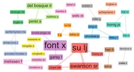 In the same way, we can see Figure 6. This figure shows different clusters formed by authors who collaborated internationally. Among them, two stand out, the purple and the red. Three authors form the purple cluster. The primary author is Xavier Font from the University of Surrey, who, as mentioned above, is the author with the most publications in this field. Together with him, a robust collaboration network was created with Lluís Garay (Universitat Oberta de Catalunya). The other set to highlight is the red one. Lujun Su, who is an affiliate to the Business School Central South University (China), is the author of that group with the highest scientific production. Although he also collaborated with Xiaohong Chen, from the same university, his principal connection was with Scott R. Swanson, professor of marketing at the University of Wisconsin, both authors having published together on 15 occasions in recent years.