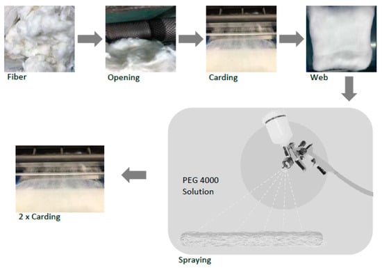 Fiber batches of 40 g were opened in a La Roche edge opener and carded once in a Mesdan 337A laboratory carding machine. Each batch was treated with 20 mL PEG solution with concentrations in accordance with Table 2. The blend CO/PES constituted 50% of each fiber. PEG concentrations were based on fiber weight, e.g., for 0.25 wt.%, 100 mg PEG was diluted with deionized water. The solution was sprayed on the fibers using a high pressure spray gun set at a pressure of 0.02 MPa and subsequently left to dry for 2 h at room temperature. After drying, two 40 g fiber batches were carded twice into 80 g webs used for inter-fiber cohesion testing; see Figure 1 for a process overview.
