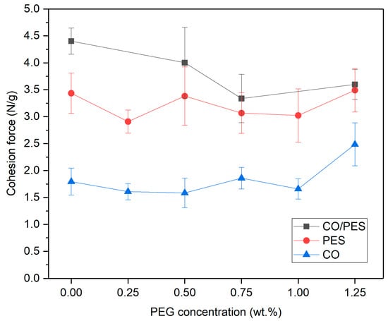 Cohesion test result for CO, PES, and CO/PES fiber webs with different treatment concentrations of PEG (Table 1) are shown in Figure 3. The trend is that the CF decreases at 0.25 wt.%, after which the cohesion seems to increase for PES and stay at approximately the same level for CO before increasing at 0.75 wt.%. For PES fibers, the cohesion decreases at 0.75–1.00 wt.% before increasing again. For both PES and CO, the CF increase at 1.25 wt.%. The trend for CO/PES is a decrease in cohesion with the lowest point at 0.75 wt.%. Previous research on how lubricant concentrations affect the friction or cohesion of fibers show that, after an initial increase, friction decreases and is subsequently followed by a further increase [20]. Another work found a minimum friction value at low concentration [21]. The low concentration minimum is explained by a mono-layer of lubricant filling the grooves of the fiber [20,21]. With higher concentration, the lubricant sticks to itself between fibers, increasing the cohesion between fibers [20]. However, to our knowledge, there is no research that describes the effects of PEG concentration dependence on fiber-fiber interactions.