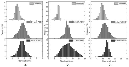 The average length of these fibers increased on PEG treatment of fabrics before the tearing process, as seen in Table 4. The fiber length distribution for recycled fibers can be seen in Figure 4. The concentration of PEG affected the fiber length. The change was most pronounced in PES, and it can be seen that the treatment with 0.7 wt.% PEG gave fibers as long as 28 mm, while the longest for the 0.2 wt.% PEG was 20 mm and 10 mm for the untreated fabric. Fiber length distribution was also generally wider after the treatment. This could be due to the fact that the fibers in the treated fabric broke less during processing and thus gave a wider range of lengths. These results fall in line with other results in this work.