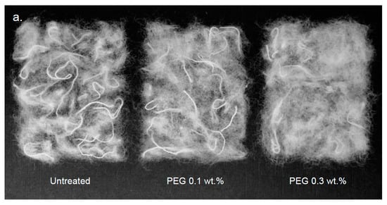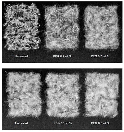 Effect of lubricant on the efficiency of the tearing process was evident on CO and PES fiber samples, which is shown in Figure 5. This representation of the recycled fibers shows visually what has been shown in numbers in Table 4 and fiber length distribution in Figure 4. Especially for PES, the length of fibers increased with a higher loading of PEG. In Figure 5a,b, it can be seen that the treated samples are more wooly, less dense and less threads and neps are visible. The CO/PES fiber samples also show a difference between treatments in Figure 5c, albeit a less distinct change.