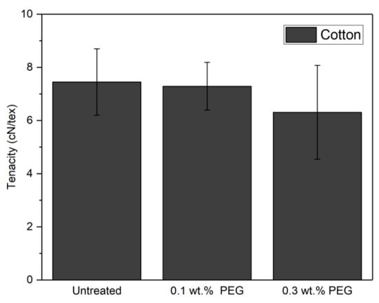 Table 4 shows the result of the analysis on the recycled fibers. A higher concentration of PEG gave a decreased fraction of unopened fiber and preserved fiber length for all fabrics. The decrease of neps and threads is shown to be 21% for CO, 50% for PES, and 18% for CO/PES. As the presence of neps is an indication of fiber breakage and mechanical stresses [30], the recycling process for treated fabrics is shown to be gentler.