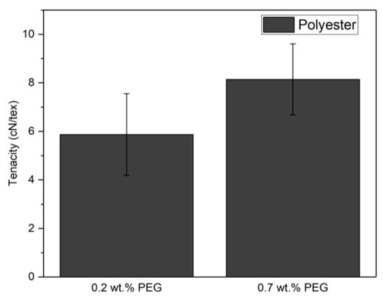 To understand the effect of lubricant in the tenacity of recycled yarn, the yarns were washed and the tenacity was retested after washing. Figure 8 show that the tenacity of each yarn is higher after washing. Due to the difficulties in producing yarn from PES treated with 0.2 wt.% PEG, the quantity of yarn was not enough to test the tenacity after washing.