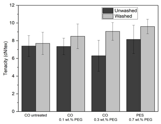 After washing, only the 0.3 wt.% for CO had significantly higher tenacity than the untreated samples. For PES yarns, ANOVA showed that both washing and pre-treatment concentration had a significant effect on the tenacity. The Tukey Simultaneous test confirmed this.