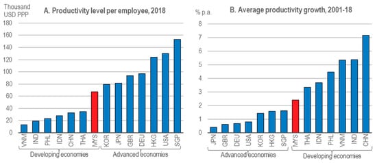 Globally, labor productivity was 1.9% in 2018, compared to 2.0% in 2017, reflecting a downward trend in the world’s growth in output per worker from the 2.9% per annum average for 2000–2007 to 2.3% for 2010–2017 [2]. Malaysia has fallen behind most advanced countries in its labor productivity level. In 2019, for example, Malaysia’s labor productivity was approximately half that of the United States and Singapore, based on terms of purchasing power parity. On the other hand, Malaysia exceeded its regional peers, including Indonesia, Vietnam, Thailand, China, and India. However, these countries have higher labor productivity growth than Malaysia, which means that they are rapidly catching up in labor productivity [3] (see Figure 1).