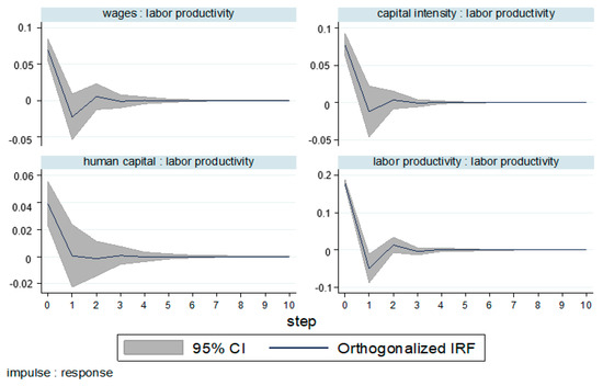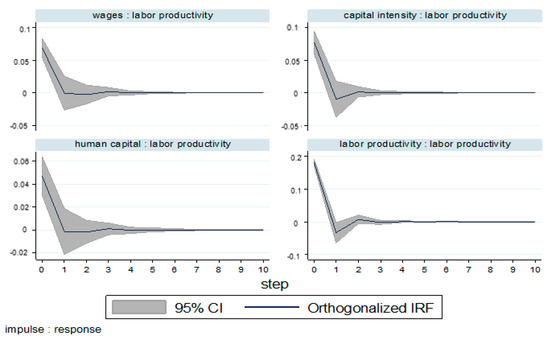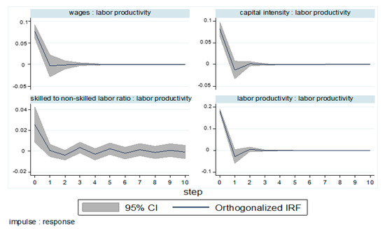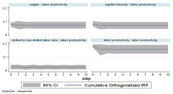 The estimated PVAR parameters do not provide much information, according to Galariotis et al. [79]. The moving average (MA) representation of the VAR model, namely, the IRF and the FEVD, should be focused. Therefore, these IRF and FEVD provide valuable information in achieving the focal point of this study, which examines how labor productivity responds to a surprise shock for all variables in the system. Following some previous research [79,80] that did not discuss the estimated PVAR parameters, we thus only report the IRF and FEVD. However, the full result of the PVAR coefficient is available upon request.