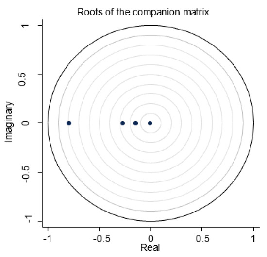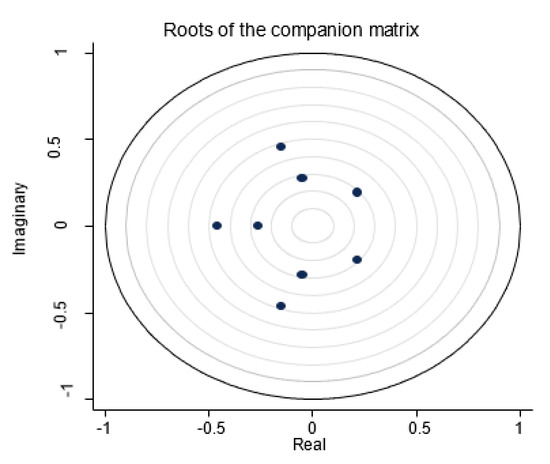 This study reports evidence of the stability properties of the estimated PVAR model in Table 5 and Figure 2. The stability of the PVAR requires the moduli of the dynamic matrix’s eigenvalues to lie within the unit circle, and our estimated model satisfies this condition. Referring to the eigenvalues (below one) in the estimated model, the PVAR model was found to satisfy the stability condition that presents invertibility and infinite-order vector moving-averages (VMA). Both Brüggemann et al. [81] and Hamilton [82] implicated VAR stability in every instance wherein every modulus in the companion matrices returned values lower than one.