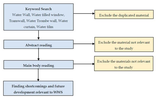 The literature search process started with the defining of keywords. The keywords were defined after sample searches and sample paper reading. The keywords were Water Wall, Water filled window, Transwalls, and Water Trombe walls. All of these terms were synonyms or similar types of façade systems to WWS. Then the titles and abstracts of the search results were read to exclude the literature unrelated to the objectives of the research. The screened results were categorized according to energy-saving and fire safety. As there were no search results on the fire safety aspect of WWS; additionally, the key word Water curtain crossed with Fire safety was used to gain insight on fire safety from WWS. At last, the analysis of the contents of all the screened literature articles, books, chapters, proceeding papers, online publications, reports, standards, and theses revealed the up-to-date knowledge on the WWS performance for energy efficiency and fire safety, and uncovered the under-researched areas related to the application of WWS in green buildings.