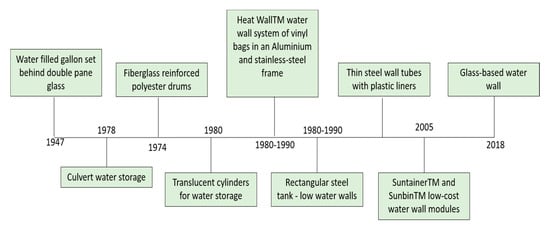 The water wall built by Hoyt and his students (1947) in Massachusetts Institute of Technology in the United States using a series of 1.5 gallon cans, located behind a double-pane glass and painted in black, is claimed as the first recorded WWS in the world [47,48]. This WWS was able to provide 38–48% of the heating demand in the building. After some years, in Mexico, a school was designed with a large water tank for each building which serves as a water storage tank as well as a WWS. The buildings were stated to be very comfortable, but there are limited details available on this WWS. In 1972, WWS emerged back again in New Mexico in a space-age architecture designed by Steve Baer named Corrales house. This WWS was comprised of 55-gallon drums full of water, and as reported, this system worked very well. Steve Baer used water walls on both residential and commercial ventures. Many building designers were influenced by Steve Baer’s work, including Jon Hammond, Tod Neubauer, Marshall Hunt, David Brianbridge, Marshall Hunt, and Denny Long, who did excellent water wall retrofit projects. In later stages, the water drums used for the energy storage have been replaced with thin water tubes made of different materials. At this stage, the commercial production of the WWS has been initiated. Further, the focus has been shifted for the designing of more aesthetical building elements, where the designers have recognized the glass as an attractive material for WWS. Figure 3 depicts the evolution of different types of water wall systems.
