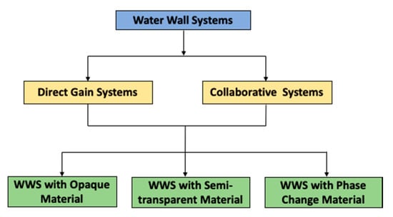 The WWS, as a façade component, has a long history. The development of WWS started with the introduction of water drums or containers to the building façade to act as a thermal mass. These walls were known as solar barrel walls. Since then, WWS has undergone several technological and design enhancements to cater for the growing needs of sustainable development. With these enhancements at present, the designs of WWS are much focused on the inclusion of water as a layer between two panes made of different materials. This pane material should be chosen for the construction purpose. Based on the position of the water wall within the building, “Water Wall Systems” can be mainly categorized into two types, as direct gain systems and as collaborative systems, as shown in Figure 4. In both, water acts as a thermal mass for heating and cooling.