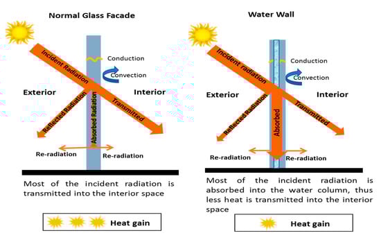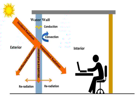 The WWS’s operational criteria is to increase the thermal comfort in the building interior against the annual environmental changes in the outdoor environment. This is accomplished mainly through the thermal mass gain of water, which has the ability to thermally stabilize envelopes in summer and reduce heat loss in winter through them. Besides, a transparent WWS helps in increased energy efficiency by maintaining an optical transparent stage all the time so that visible light can be transmitted directly through them during the day. In principle, the work of WWS depends primarily on the thermal and optical characteristics of the cavity filling materials. As shown in Figure 6, the solar energy incident on a semi-transparent water wall is partially absorbed and partially transmitted. The absorbed portion is eventually transported to the room while the transmitted fraction induces direct heating as well as daytime lighting in the room. When the outdoor temperature is declining in the nighttime, the WWS moderately heats the building interior [39] as shown in Figure 7.