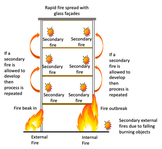 A building façade should be planned to limit the spread of fire to the inside of the building built to restrict fire spread inside the structure, to the adjacent floors, and to the outside of the building, allowing the evacuation of building occupants and ensuring the safety of the rescue team [93]. Moreover, the façade needs to be constructed in a manner that stops parts from collapsing throughout the evacuation and rescue team activities. However, a standard glass façade is more vulnerable to fire spread than a conventional façade made with bricks, stone, or concrete, and can easily break within a matter of minutes [94,95,96] when exposed to fire. This collapse of glass panes introduces a new airflow for fresh air and fire spread outdoors, enabling the phenomenon of flashover or backdraft [97]. Compartment fire dynamics may be drastically modified, triggering more serious disasters [98,99]. The possible ways of fire spread through a glass façade are elaborated in Figure 8.