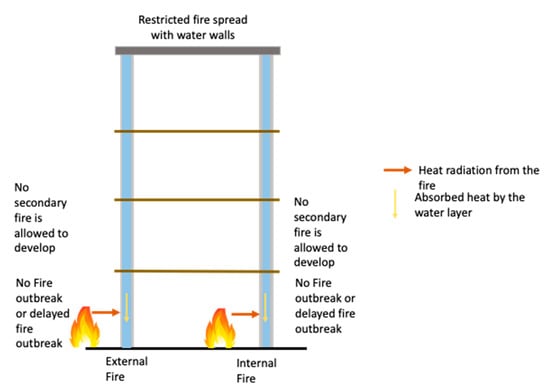 The characteristics of WWS make itself potentially a fire safety construction element. Water is used to extinguish flames. Especially water film and water curtain are used on glass panes to prevent breakage [106,107,108,109] since glass breakage influences the fire spreading, as explained previously. However, glass cracking typically happens in the rapid cooling phase rather than the rapid heating process, owing to the thermal shock induced by sudden cooling, which is a problem associated with water films and water curtains [110]. This issue can be overcome by a WWS, as a WWS always has a continuous water layer between two glass panes. The heat passes through the interior or exterior glass pane and is absorbed by the water column from the fire initiation. Therefore, it is reasonable to expect that to heat up the glass pane until its breakage stage will take a longer time. The WWS offers abundant faster heat exchange than a typical wall fabricated from concrete or brick because the heat stored in water could also be decentralized through convection. Compared with other building materials, water has a high specific heat capacity of 4.2 kJ/kg.K, while concrete has a specific heat capacity of 0.880 kJ/kg.K only [111]. With the water layer, the glass panes are maintained at a lower and perhaps more uniform temperature and will not be easily broken by the water sprayed by a fireman during a fire. The mechanism by which a WWS enhances fire safety is shown in Figure 9.