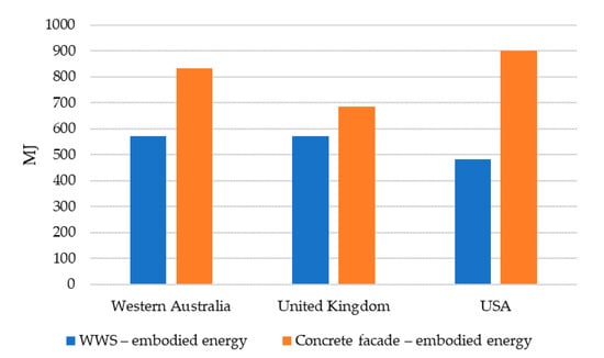 A WWS embodied energy comparison against a concrete facade for different countries (per 1 m2 of the façade) (Sources: [115,116,117]).