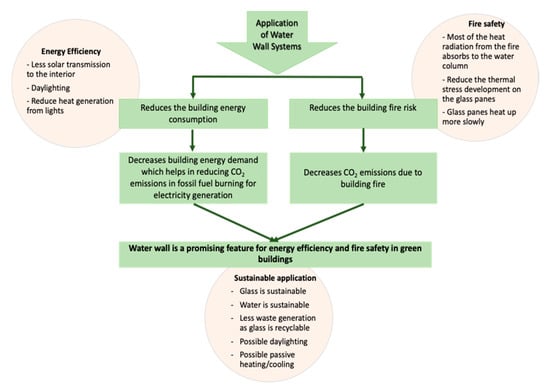 Glass façades are widely utilized in green buildings. Ensuring fire safety while reducing the energy need without compromising occupants’ comfort is a challenge in the modern-day green buildings with glass façades. One way of achieving both aspects is to construct a water wall system as a building façade. A water wall system has a water layer between two glass panes and can be considered as a glass façade system. The focus of this review, which builds on the published studies, is how water wall systems can help ensure fire safety and reduce energy demand in green buildings. The water layer within two glass panes of the water wall system store the solar radiation heat throughout the daytime, reducing the amount of heat transferred through the building facade. The reduced heat transfer effects lessen the need for air conditioning to sustain the thermal comfort of the building occupants. The stored energy is released during the nighttime. The transparency of the water wall system also allows daylight to enter the building, thus reducing artificial lighting needs. Furthermore, the water layer acts as a fire safety mechanism in case of a fire. However, the water wall systems are not much utilized in the modern-day green buildings due to their unpopularity and the unavailability of design guidelines. On the basis of the findings of the literature review, stakeholders and the public are encouraged to adopt water wall systems in green building projects as an energy-efficient strategy and a fire safety mechanism.