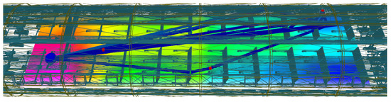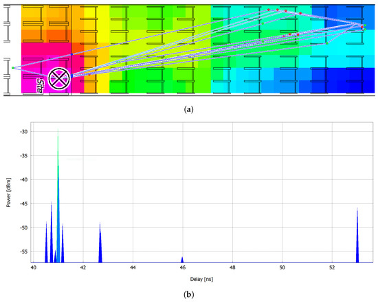 Figure 9 provides a specific example of a multipath reception within the aircraft cabin. Possible signal paths are transmitted from the transmitter located at the left side of the figure to a receiver field on the right (Figure 9a). Additionally, reception signal powers are visualized. A depiction of the received CIR from the propagation scenario is shown in Figure 9b, which plots the paths reception power as a function of the time delay.