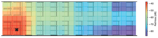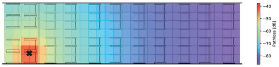 At first, the results for a path-loss based on (2) are depicted in Figure 5. The calculation of the path-loss given the marked transmission antenna is performed for a discrete 50 × 50   cm grid. The actual level of values can vary depending on η parameter setting, which was set to η = 2 for the shown results.