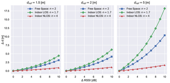For the introduced application domain of RSSI based contract tracers, the implied consequences of insufficient environmental modeling errors are substantial as they lead to non reliable tracing results. Further supporting this argument is Figure 7, which shows the distance estimation errors Δ d as a function of measured RSSI errors Δ RSSI . Thus, three reference distances are used ( d 1 = 1.5   m , d 2 = 2   m and d 3 = 5   m with respect to commonly applied path-loss exponents (taken from [28]).
