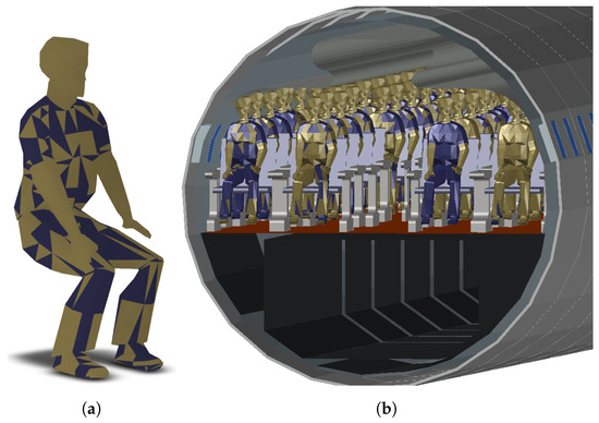 Figure 10. Three-dimensional model of cabin passenger as an addition for the proposed propagation simulation: (a) shows the model of a single sitting passenger and (b) depicts a fully occupied aircraft cabin model.
