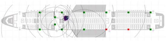 For future work, we intend to incorporate contact tracing and absolute position tracking of passengers in our connected cabin sensor framework, enabling control of passenger flows and therefore actively reducing transmission risks in a pandemic scenario. Figure 11 shows a part of our positioning GUI based on stationary anchor nodes and mobile devices using a Particle Filter approach [43].