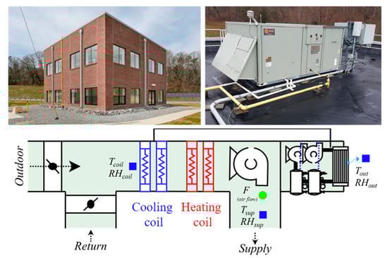 The flexible research platform (FRP) in Oak Ridge National Lab (ORNL) was used for the RTU experiment (Figure 1). It is a common two-story lightweight commercial building consisting of slabs and a steel superstructure with a footprint of 13.4 m by 13.4 m. A 44-kW RTU with a DX cooling coil system conditions zones of the building with an air handling unit (AHU) and VAV boxes in each room, as shown in Figure 1 (right). The DX cooling system consists of two cooling coils that operate with two stages. One cooling coil turns on in stage 1, and two coils are on in stage 2. Stage 2 is triggered when the supply air temperature is not maintained at the setpoint (e.g., 12.8 °C (55 °F)).