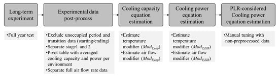 Figure 2 presents the process to obtain the RTU model from the experiments. The process includes (1) a long-term experiment (e.g., a full year), (2) post-processing to obtain steady-state experimental data, (3) cooling capacity curve estimation, (4) EIR curve estimation, and (5) PLR curve estimation.