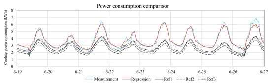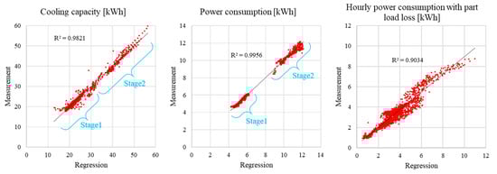 Figure 3 (left) shows the result of the regression for the cooling capacity. The horizontal and vertical axes represent the regressed and experimental value. The root mean square error (RMSE) of the model compared to the experimental data is 0.96 kWh, and its correlation coefficient (R2) is 0.98. The coefficients for EIR (CEIR,i (i = 1–9)) were estimated in the same fashion. Figure 3 (center) shows the result of the regression for the power consumption. The RMSE and correlation coefficient are 0.14 kWh and 0.99, respectively.
