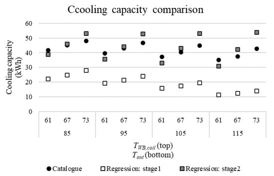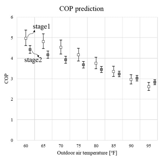 The performance of the estimated RTU model was compared with that of the manufacturer’s data (Figure 4). We assume that the performance data with gross cooling capacity in the manufacturer are based on stage 2 operation. According to the comparison, regression with stage 2 operation is close to the manufacturer data. Unfortunately, no cooling power data are provided from the manufacturer. Even though the manufacturer data follow the performance trend of the actual measurement, they are limited as only stage 2 operation is provided, and cooling power performance is not given.