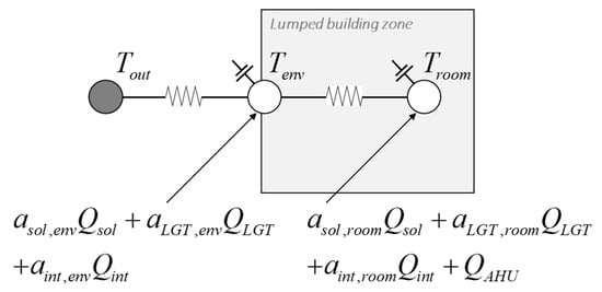 To simplify the building model, the 10 building zones were lumped into a single-zone model, as shown in Figure 10. This is the 2C2R model with one boundary temperature (Tout), one control input (QAHU), and three disturbance inputs (Qsol, QLGT, and Qint). The cooling rate from the supply duct to each zone and the internal heat gain are summed and input to each state (envelope and room node). The heat gain from the lighting (QLGT) and internal equipment (a heater in this study, Qint) are distributed to the envelope and room nodes; αLGT,room + αLGT,env = 1 and αint,room + αint,env = 1. The corresponding state-space formulations are shown in Equations (2) and (3).