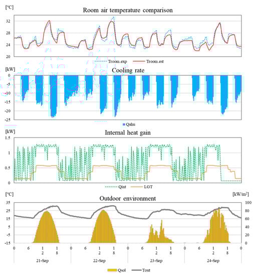 Figure 8 shows the validation results along with environmental data. The simulated RTU cooling power consumption and delivered cooling matched well with the experimental trajectories. The simulation trajectory of the average (volume-weight) room air temperature follows the trend of the experimental trajectory. However, it was impossible to match all trajectories of the room air temperatures (not shown in the figure due to the page limit), which vary according to characteristics such as the room size, window orientation, and window-wall ratio.