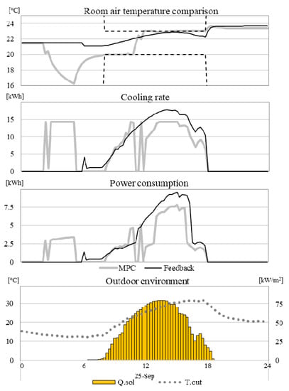 Figure 12 shows the performance comparison of the MPC and feedback control. It shows the room air temperature, cooling rate, power consumption of the RTU (regressed model in Section 2), and disturbances, including solar radiation and outdoor air temperature. The cooling rate was input to the zone when the outdoor air temperature was low and the corresponding COP was high (e.g., 2 a.m. to 5 a.m.) in the MPC. The amount of power consumption of the pre-cooling was relatively low due to the higher COP at night. The relative savings potential of the MPC in the power consumption is 14.4% compared to the feedback control. The cost saving is 12.5% when the typical electricity cost at the time of use (TOU) was applied; we assumed that the peak price is twice the off-peak price, and their average is 12.7 ¢/kWh which is approximately the nation-wide average [31]. The cost saving can be increased when a more aggressive TOU policy is applied. The results are summarized in Table 2.