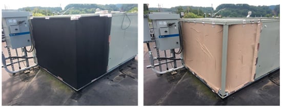 Condenser fouling refers to decreasing the airflow rate across the condenser fan due to dust, dirt, or litter on the condenser unit’s fins. This fouling degrades the heat transfer rate between the refrigerant in the condenser unit and the air induced by the condenser fan. To emulate this fault without damaging the facility, two different levels of porous fabrics were applied on the external surface of the condenser, as shown in Figure 14. Air reductions of 28% and 58% were achieved compared to the case without the fabric according to manual measurement with a hand-held airflow meter.