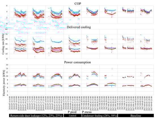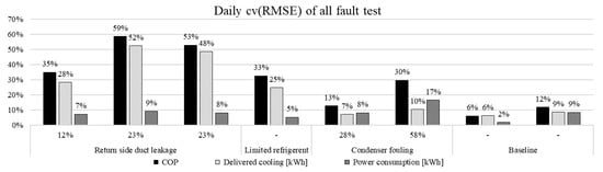 Figure 15 shows the results of the three fault tests along with the baseline case. The COP, delivered cooling, and RTU’s total power consumption are shown with 1-min resolution. Transition data for turning on the RTU and between stages were deleted as a bias to evaluate the prediction performance of the model. The error metric was evaluated with the daily cv(RMSE) in percentage (%) and is summarized in Figure 16. As one can see, the prediction with the estimated model and experimental data matched well at baseline. However, in all cases, the power consumption does not deviate as much as the COP and delivered cooling. It can be concluded that the fault should not be evaluated with only power consumption prediction but also with the delivered cooling prediction or COP, which is calculated based on the delivered cooling.