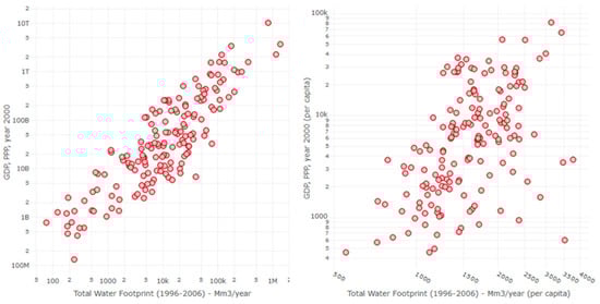 Here, we have put together GDP in PPP and total water footprint for all countries of the world and we came across with the results plotted in Figure 1. As clearly shown in the left panel of Figure 1, the water footprint linearly expands with GDP (Pearson correlation coefficient, r = 0.71). Indeed, when using absolute numbers, no country has a large GDP and low water footprint. In fact, the largest economies in the world, the United States, China and India, present massive water footprints (the three points in the upper corner), while also being the major gross exporters and importers of virtual water [7]. The results given in per capita terms (right-hand side of Figure 1) provide, instead, a less clear correlation (but a correlation nonetheless) between GDP and water footprint (r = 0.41).