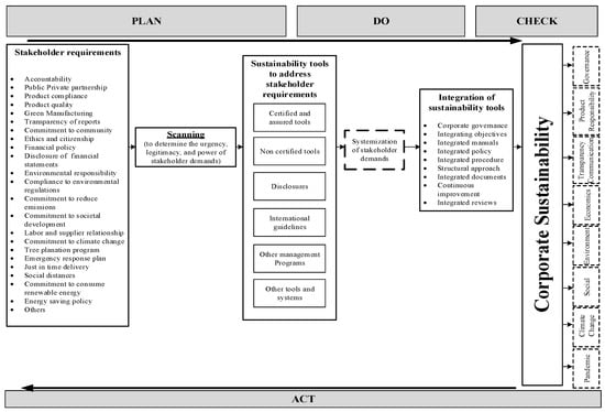Each of these sustainability criteria has a total of forty-five sub-criteria. These criteria were identified after reviewing and summarizing the literature. The results of which criteria and sub-criteria are shown in Table 2. Next, we attempt to extend the corporate sustainability model based on the ‘Plan, Do, Check, and Act’ (PDCA) approach, as presented in Figure 2.