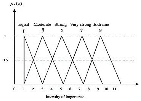 After designing the problem structure in a hierarchical way, the next step is to define the scale of relative importance in order to construct a pairwise comparison matrix. Table 3 presents the TFN, which are from 1 to 9, and are used to improve the accuracy of the traditional model. We employed five TFNs relative to correspondence number for expert qualitative assessment in order to capture the vagueness and remove uncertainties. The fuzzy membership for attributes and sub-attributes is shown in Figure 4.