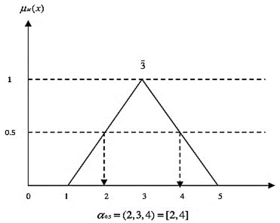 To make the expert and decision-makers judgments more confident, the α-cut method can be used through the ranking of fuzzy numbers, in which it provides an interval of values based on fuzzy numbers. Figure 5 presented the α-cut method on TFN for this instance, if will yield .