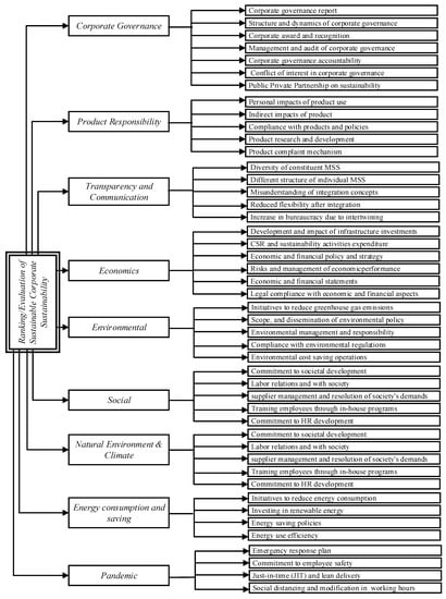 We considered various decision attributes and indicators for the development of a multidimensional sustainability framework. These attributes can assist in the construction of an effective corporate sustainability model while also providing insights into sustainable business practices. This study develops a decision criterion for sustainable development based on the literature and then checked the criteria validity provided by key expert’s contributions. The main sustainability criteria in our development of a sustainability framework include Corporate Governance, Product Responsibility, Transparency and Communication, Economics, Social, Environmental, Natural Environmental and Climate Change, Energy Saving and Consumption, and what we believe to be used for the first time, the COVID-19 pandemic criteria. As per the best of the authors’ knowledge, pandemic impacts have not been used before in sustainability models to date, the consideration of COVID-19 pandemic effects will help to fulfill a gap in the literature.