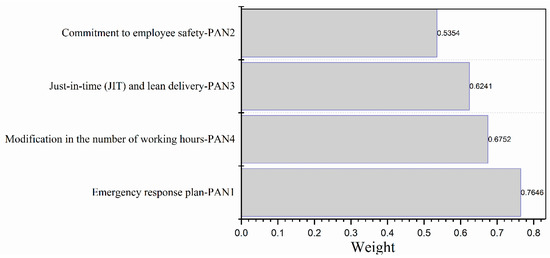 According to the calculation of the main sustainability attributes’ weights, the Pandemic attribute came first in the main corporate sustainability criteria. To this end, organizations should develop an emergency response plan to tackle any emergency, which may become a hurdle in the effective implementation of corporate sustainability. Hence, organizations should develop a sustainable structure that can prevent the organization from crises. Moreover, organizations should also implement suitable and long-lasting sustainability practices that assure optimal progress toward sustainability and provide benefits while utilizing scarce resources. Further, it was observed that the delivery time of goods supplies has been drastically disrupted due to the COVID-19 outbreak. Therefore, organizations need to develop a sustainable delivery system like just-in-time (JIT), which provides a more resilient solution during any emergency faced by the organization. Economic sustainability, governance, and natural environment and climate took their position after the pandemic attribute. Whereas product responsibility came last and observed the least essential attributes by obtaining the lowest weight (0.0492). The 45 sub-attributes of the study were evaluated through with the help of expert’s opinion, according to the pairwise comparisons matrix.