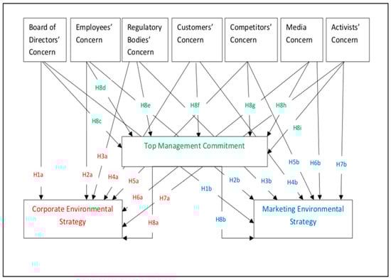 The management of a firm plays an important role in seeking out emerging sources of competitive advantage such as environmental marketing to satisfy customers and other stakeholders and in return increase shareholders’ value []. Hambrick and Mason [] put top management in the center of the nexus, and attribute organizational outcomes including both strategies and effectiveness to the values and cognitive biases of the top management. The managers of a firm play a mediating role in the relationship between stakeholders and organizational response to environmental issues [,]. Similarly, strategic decisions by the firms are not only affected by the degree of pressures from environmental stakeholders but also by the degree to which these pressures are perceived by the managers responsible for these decisions [,]. The literature has identified that top managerial commitment has a direct relationship and it also plays a role of mediator between environmental strategies and pressures from internal and external sources on organizations [,]. Hence, based on the above findings following hypotheses are proposed.